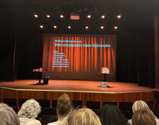 We zorgen voor een veilige setting. Zo vragen we het publiek ook niet om op het podium te komen, maar nodigen we mensen wel uit om aanwijzingen te geven aan de acteurs en om met elkaar in gesprek te gaan over wat ze op het podium zien. Dat bedoelen wij met interactief theater.